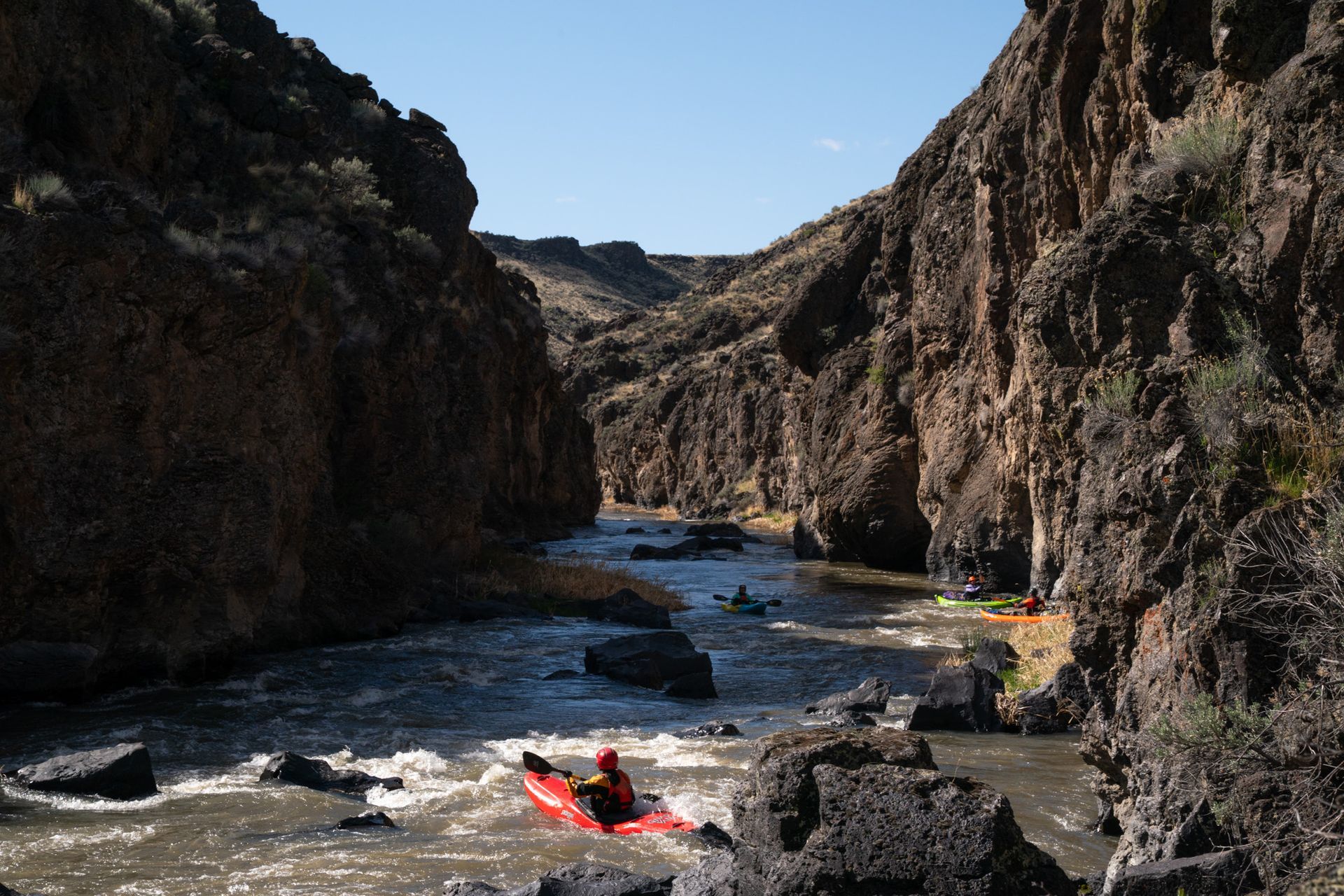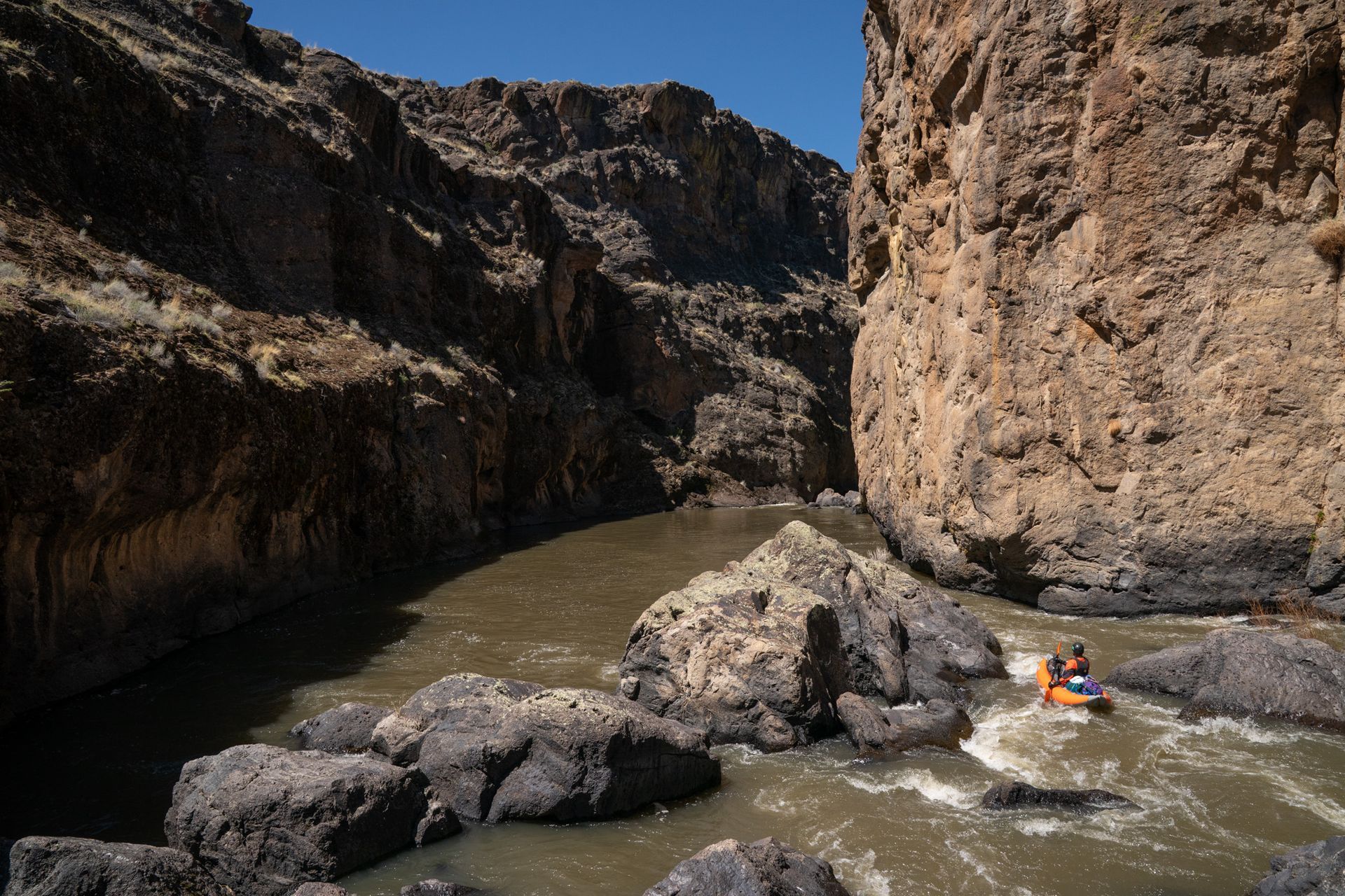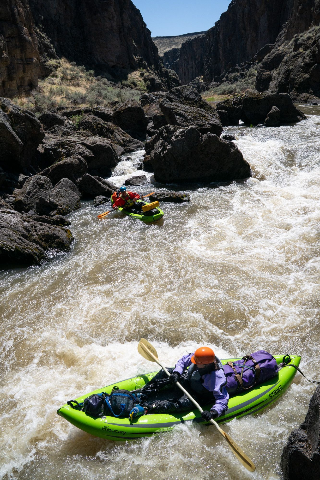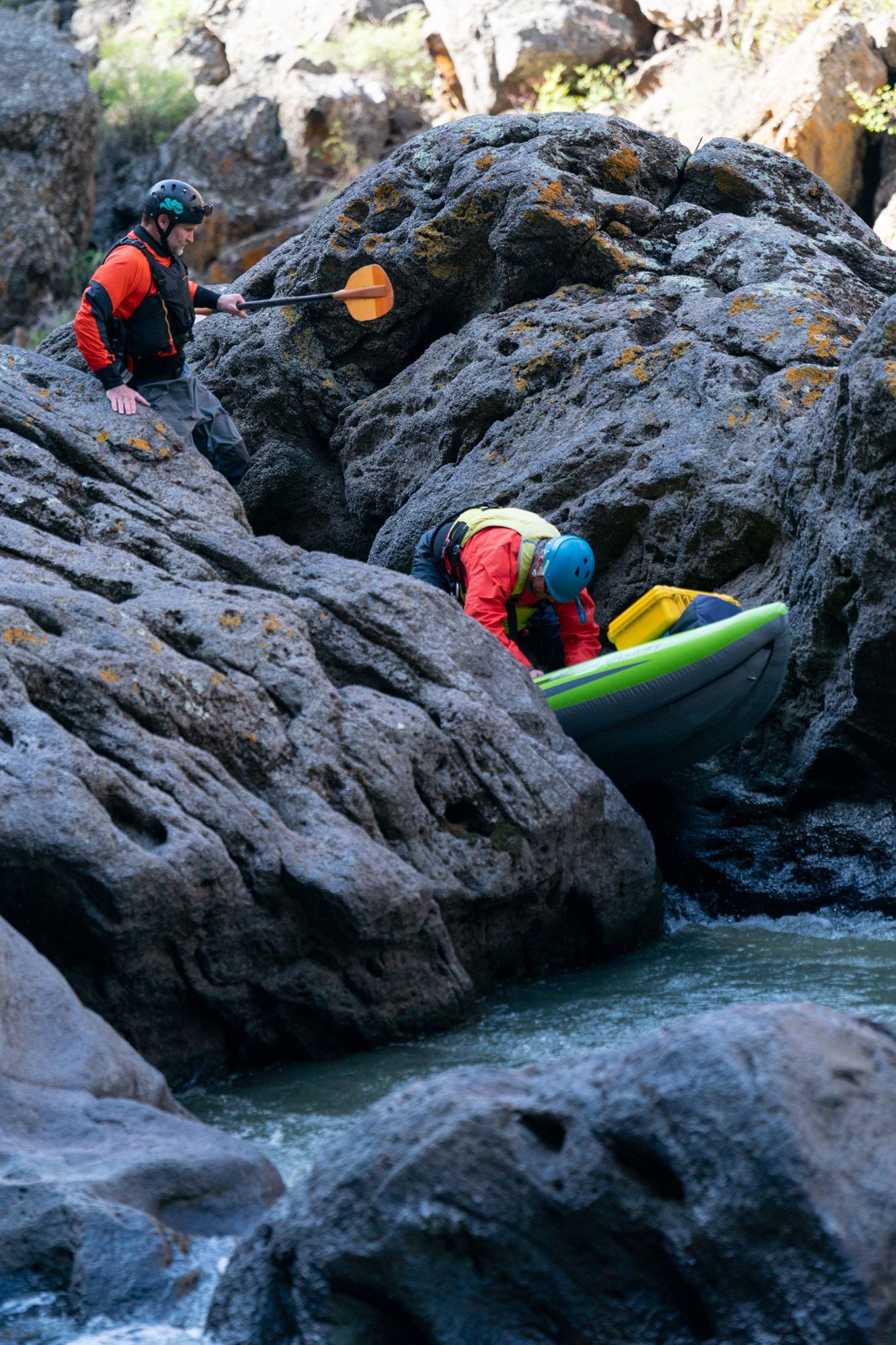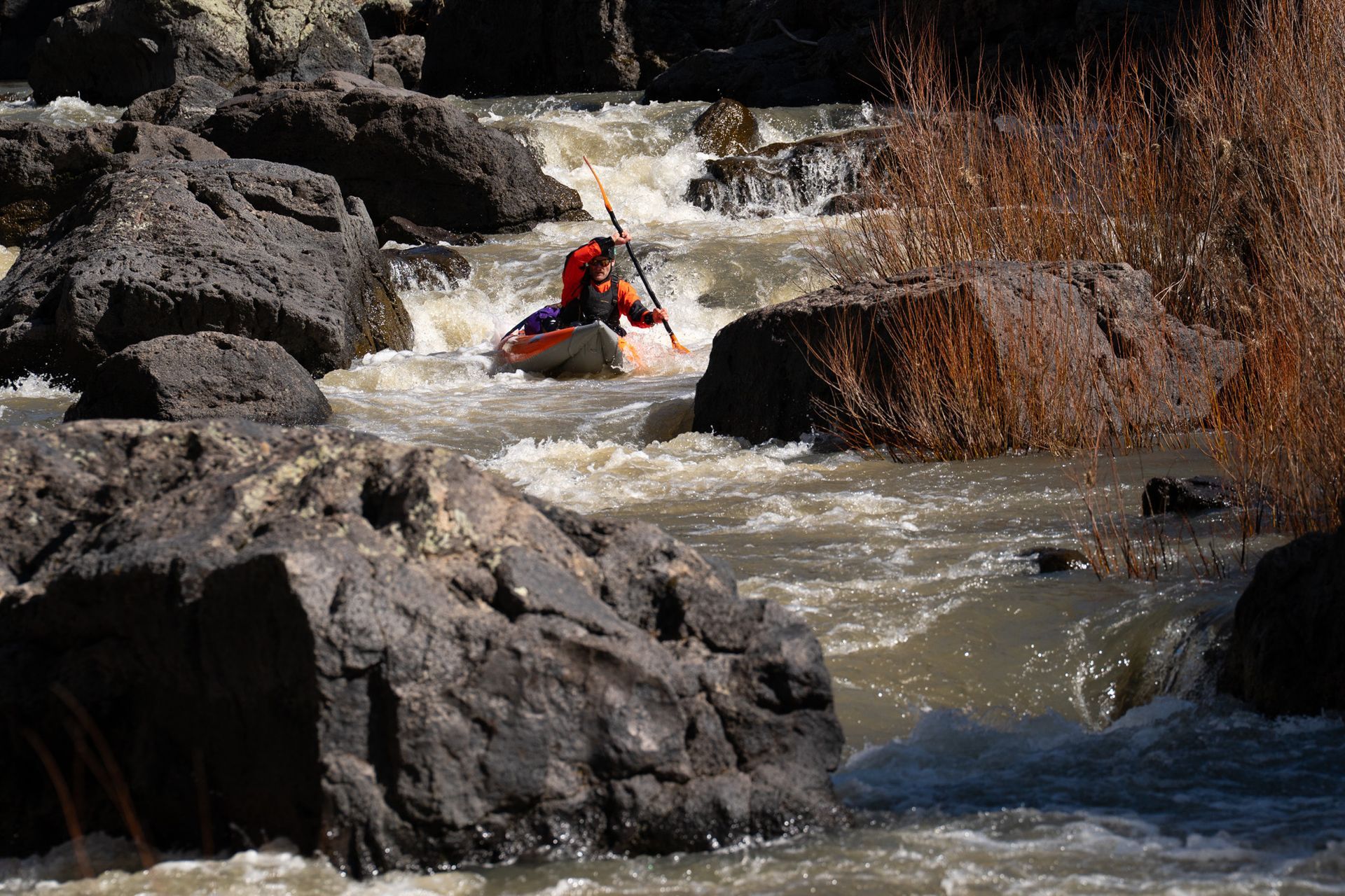 We bumped our way down the rapids with one serious mishap-a hardshell kayaker following an IK too close got pinned sideways between two rocks. What could have been a very bad situation worked itself out and no one was hurt. Rafts would have never made it down the initial stretch of whitewater at these flows; had we taken even small rafts, we would have been struggling to pull them over the exposed rocks and would have likely punctured tubes.