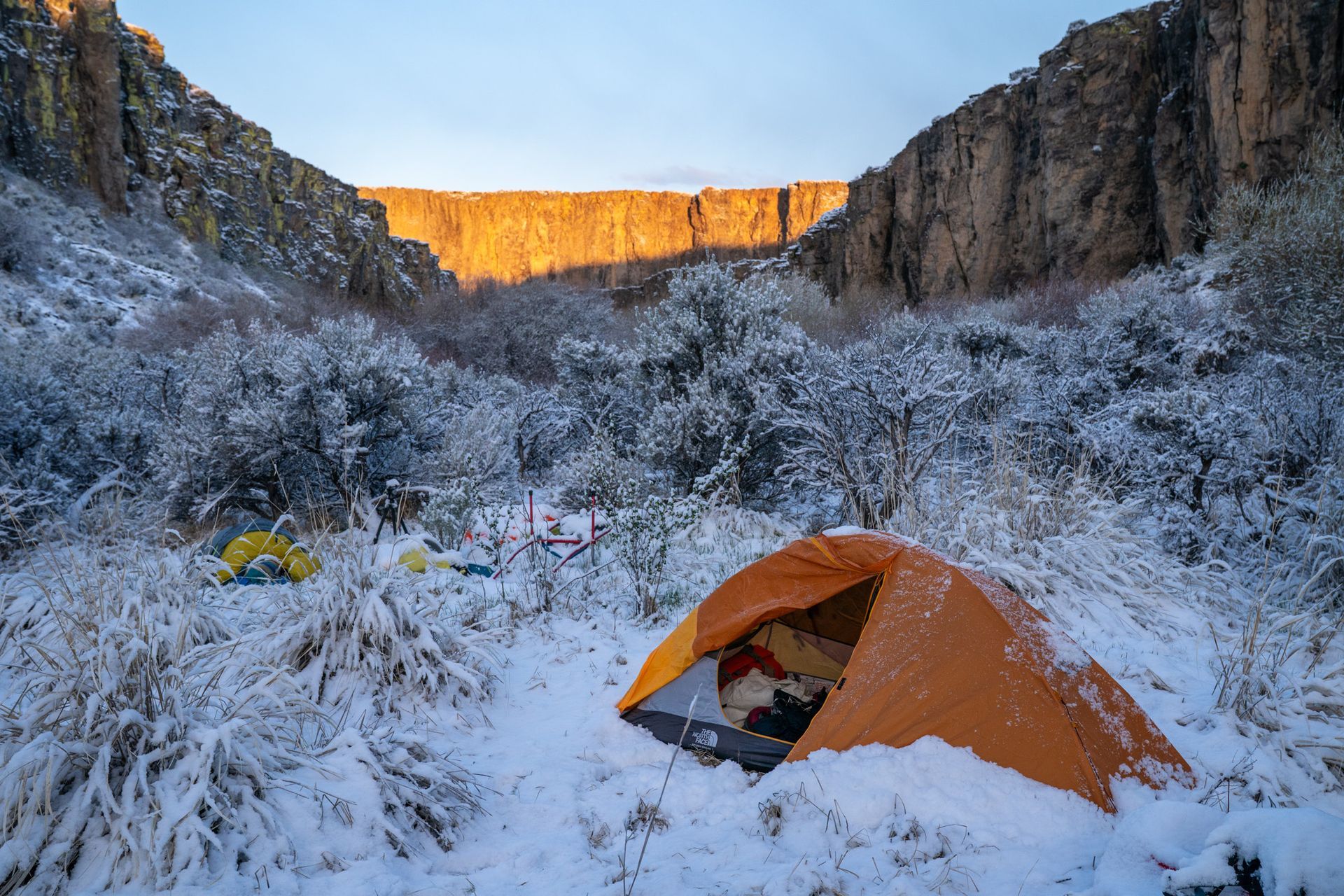 Thankfully, the sun came out and though I continued to shiver, the radiant energy and gorgeous light lifted my spirits. Once in camp, I set up my tent and crawled into my sleeping bag to get my core warm. We enjoyed dinner and a few laughs and hit the hay early thanks to the freezing temps returning once again.