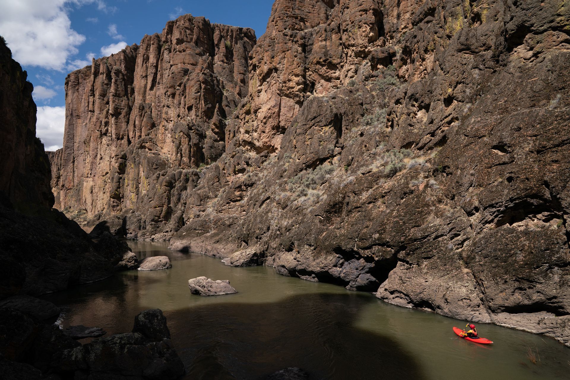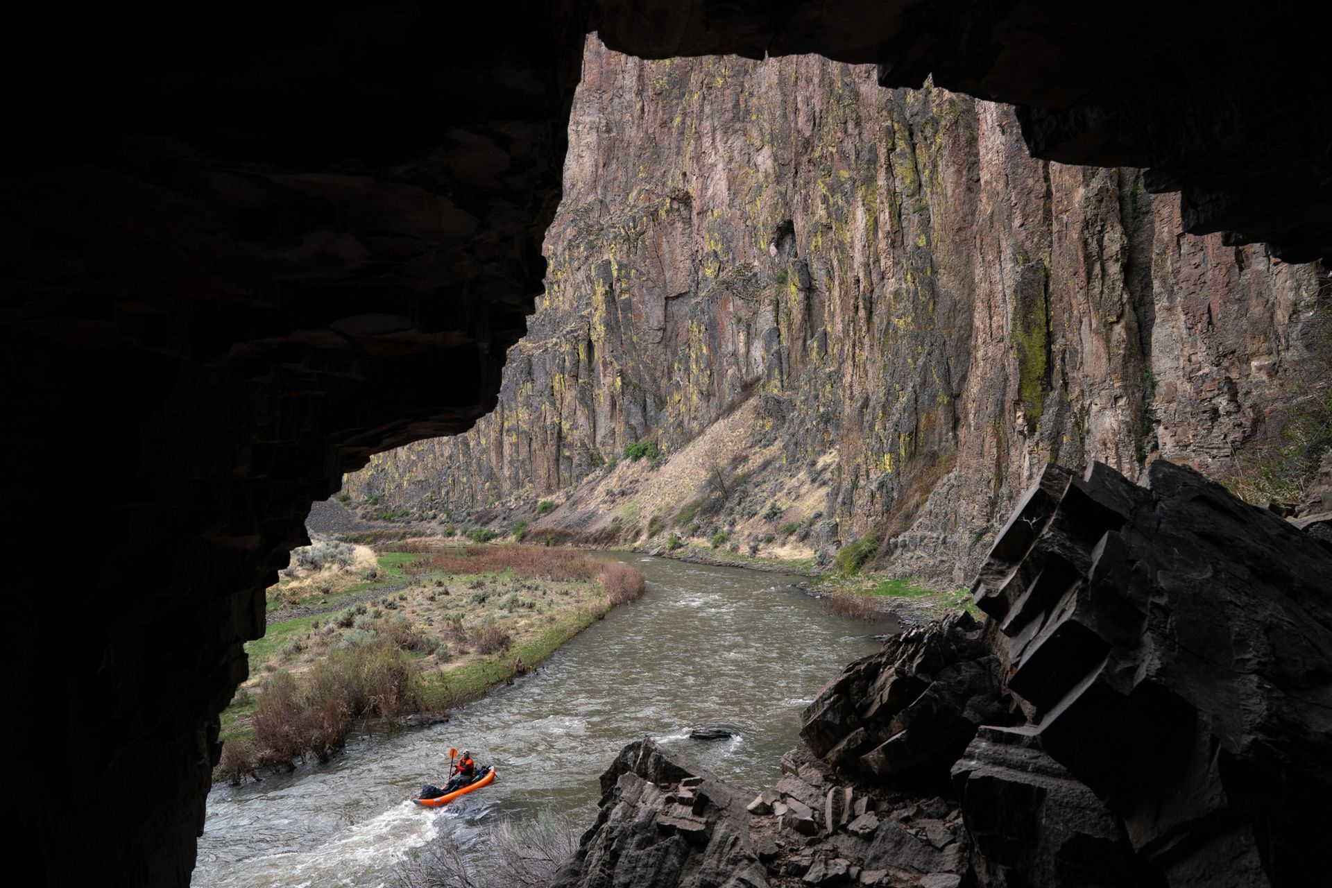 A volcanic rim acts as a portal into the canyons of the East Fork; the flat land of the Duck Valley disappears instantly being replaced by swift water, boulder gardens, and vertical walls. Due to the cold temps prior to our launch, the river's spring runoff had abated to a mere 650 cfs. Our original plan involved 3 rafts, a few IKs, and two hardshell kayaks. Now, we were a group of four IKs and two hardshell kayaks. The sun stayed away for most of the day. Even though I was in a dry suit, I shivered constantly. I had dressed with the moto I use for ski touring, "start cold and warm up with the exercise."