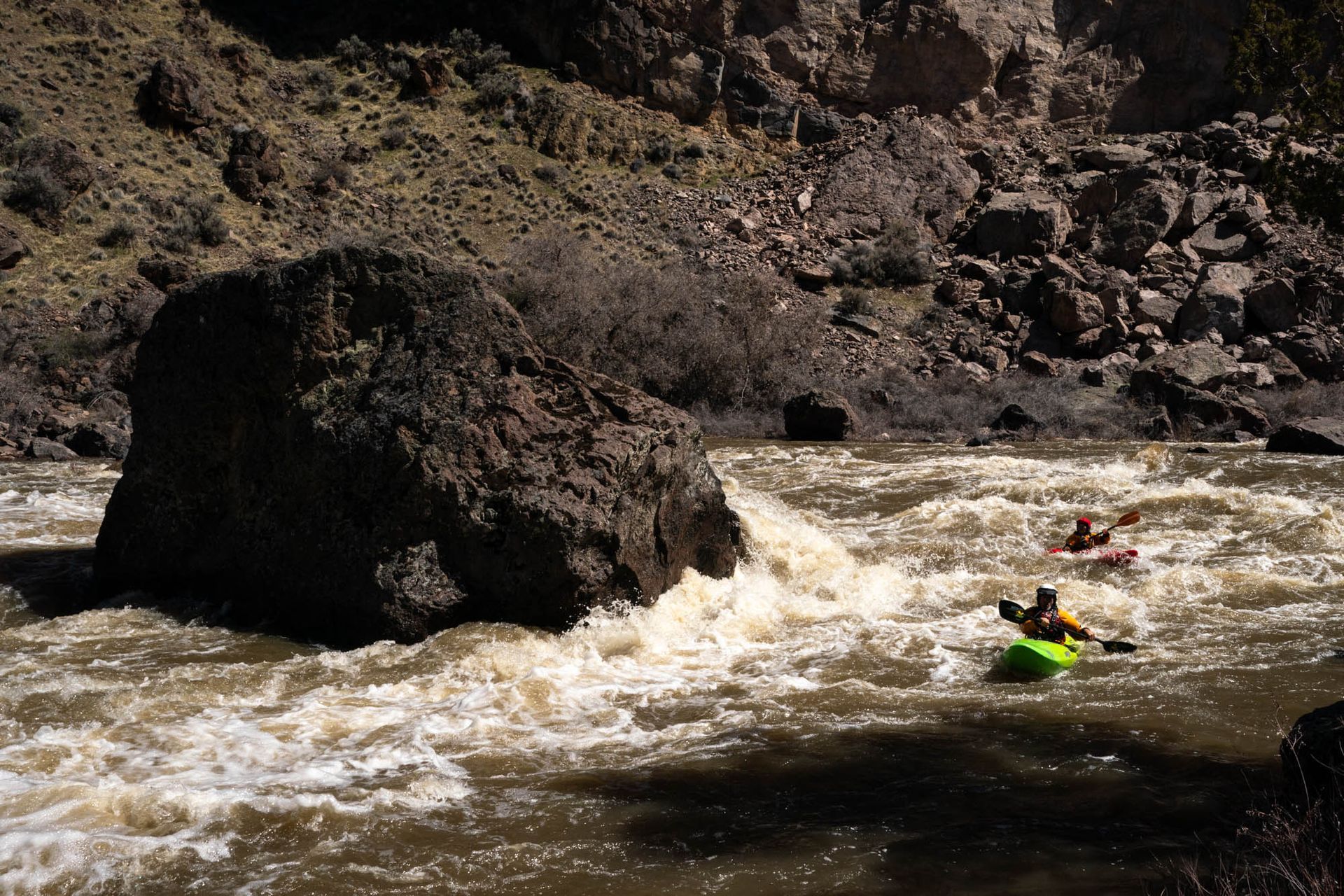 This past Spring, a group of friends and I ran the upper and middle sections of the Owyhee. We launched on April 8th as the forecast called for unseasonably warm temperatures to heat up and melt the snowpack the days we'd be on the river. As we shoved our boats into the water, the hydrology gauge in Rome, Oregon, reported less than 1000 cubic feet/sec; when we took our boats out of the water three days later--it was nearly 7000 cfs. Though we portaged the two class V rapids, the other whitewater packed a punch and got our hearts beating everytime a new horizonline appeared--the whitewater we ran was as intense as the scenery was beautiful.