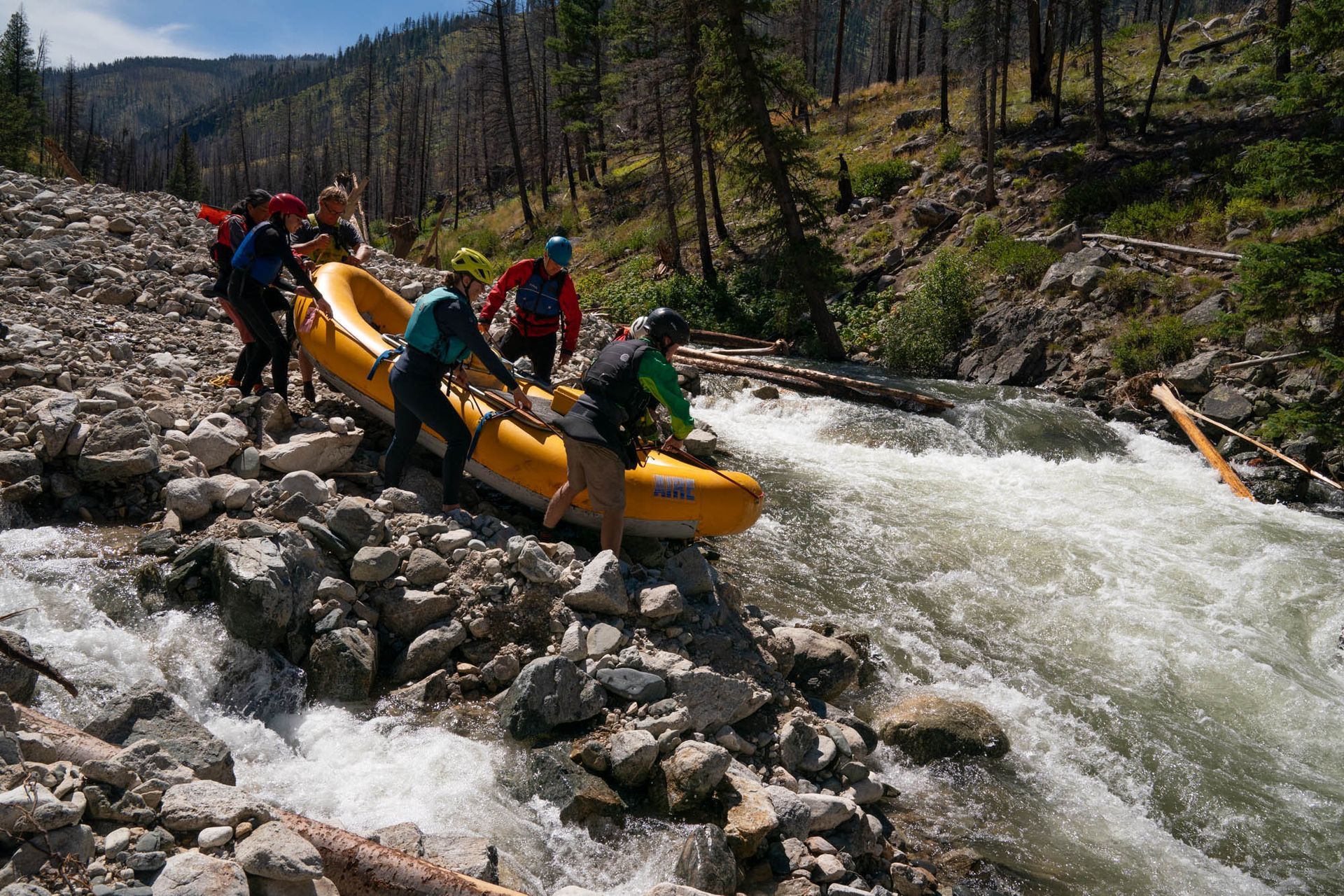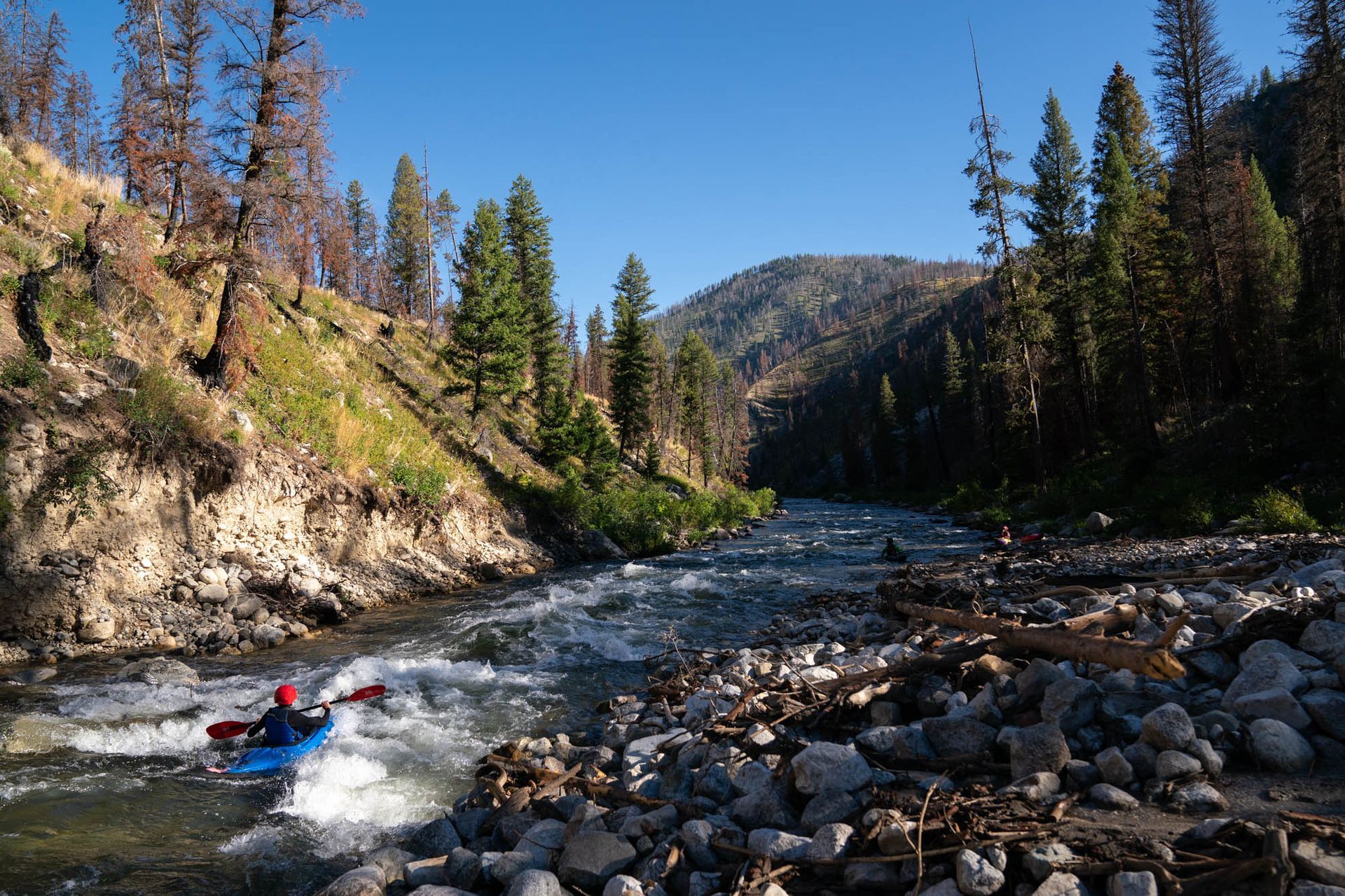After many emails and correspondences, I was given the go ahead to descend the upper Middle Fork from Boundary Creek to Indian Creek with one 12' raft, three inflatable kayaks, and four hardshell kayaks. Launching from Boundary Creek in mid-August with only my group was a treat unfathomable. Typically, there are a few dozen boats and kayaks of all sizes ready to shove off everyday from June through September. It's a scene full of Skittles colored boats and river folk psyched to get going. This year, we had the place all to ourselves.